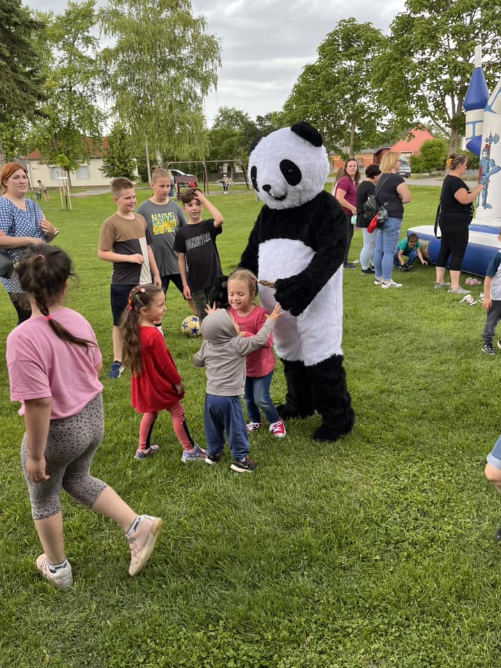 Magyaregres, gyereknap, jó hangulat, változékony időjárás, verőfényes napsütés, majd szakadó eső. De a panda haja még mindig tart. A légvárat szerencsére még minden gyerek ki tudta próbálni a rossz idő előtt, azonban az esőben úgy omlott össze a panda légvára, mint a kártyavár. Szerencsére a fedett színpad alatt a panda és a résztvevők is meg tudtak húzódni. A kézműveskedés az esőben is folytatódott.